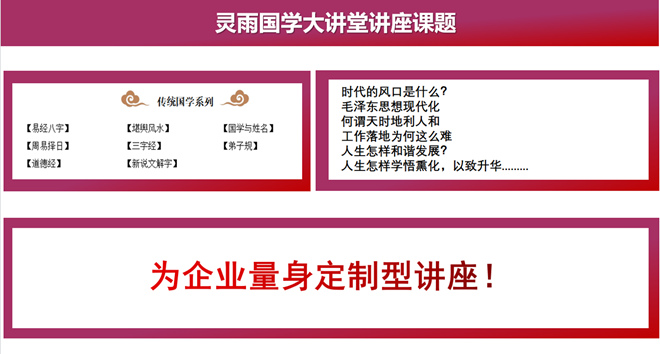 真传一句话,假传万卷经。我们始终秉承正本清源,守正创新的原则,坚持用心做真的易经八字风水专业系统培训。无论你已经是易经八字风水从业,需进修提高者;还是未来想专业从事周易八字风水策划行业的初学者,抑或是增长知识储备的兴趣爱好者,都欢迎来南京灵雨易经八字风水培训学院,进行规范的训练、系统的学习,专业的易经八字风水学习定会让你学真知,悟真道。找到我们就是缘!相信自己,选择我们是你最佳的选择!